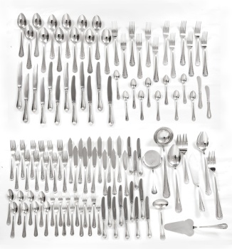 Cubertería tailandesa en metal compuesta por 145 pizas: 12 cucharas, 24 tenedores y 12 cuchillos de mesa, 12 tenedores y 12 cuchillos de pescado, 12 cucharas largas, 12 cucharas de café y 13 piezas de servir: cazo, cuchillo y tenedor de trinchar, cazo de salsa, pala de postre, etc. Estuche en madera.