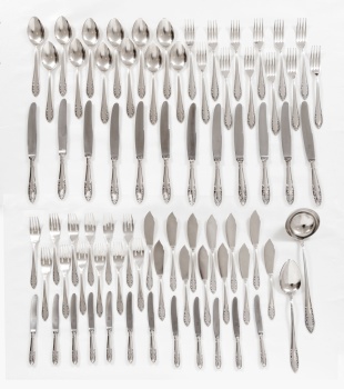 Cubertería en alpaca con decoración de flores compuesta por 111 piezas: 12 cucharas de mesa, 12 tenedores de mesa , 12 cuchillos de mesa, 12 tenedores de pescado, 12 palas de pescado, 8 cucharillas de postre, 12 tenedores de postre, 12 cuchillos de postre, 10 cucharillas de café y 9 piezas de servir cazo, tenedor de trinchar, cucharón, cazo de salsa, etc. Estilo Luis XVI.