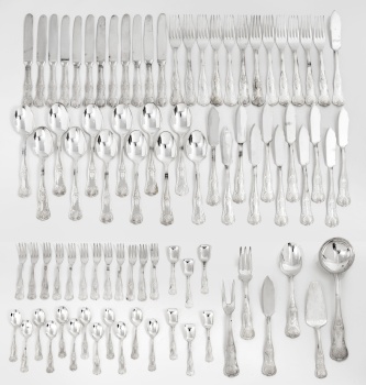 Cubertería en metal plateado con decoración vegetal y rocalla central compuesta por 84 piezas: 12 cucharas, 12 tenedores, 12 cuchillos de mesa, 12 palas de pescado, 12 cucharas y tenedores de postre, 6 cucharillas de helado, cuchara, tenedor y pala de servir, tenedor de trinchar, cazo y pala de tartas. Estilo Luis XVI. Italy.