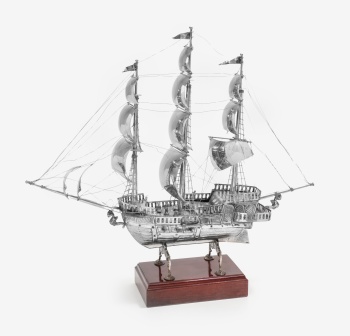 Barco en metal plateado representando carabela con personajes, cañones, etc. Base en madera.