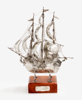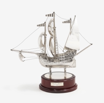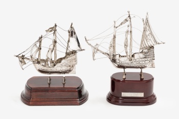 Lote compuesto por 2 barcos en metal plateado representando "Santa María". Base en madera.