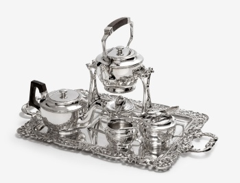Época: S. XX Medidas: 53 x 32 cm. (bandeja); 28 x 17 x 18 cm. (samovar); 11 x 13 x 21,5 cm. (cafetera); 6 x 9 x 11 cm. (lechera); 9 x 9,5 x 14 cm. (azucarero);