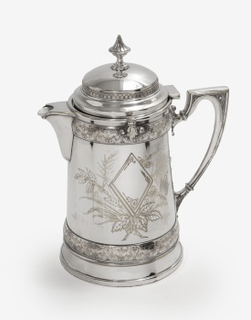 Cafetera en bronce plateado con decoración de flores, hojas, mariposas, águilas, hojas de parra, racimos de uvas, etc. Interior en porcelana blanca. Estilo Modernista. Inglaterra.