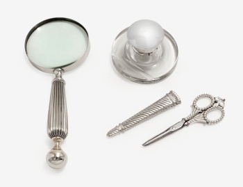 Lote compuesto por tintero en cristal con gollete y tapa en plata, lupa y tijeras en metal plateado con decoración de gallones. Estilo Regencia.