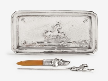 Lote compuesto por conjunto de bandeja y abrecartas en metal plateado con decoración de unicornio, bandera y flor de lis. Firmado Valentí y abrecartas en metal plateado representando cabeza de perro Pointer con hoja en resina.