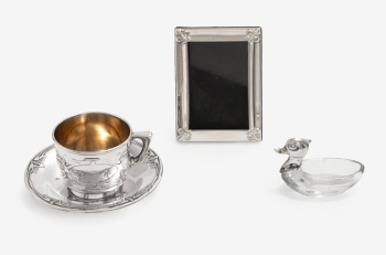 Lote compuesto por taza y plato en plata con decoración vegetal. Marcas del platero Pedregal Gijón, figura representando pato en cristal y plata. Marcas de platero y portarretratos en metal plateado con decoración de flor de lis. Estilo Luis XVI.