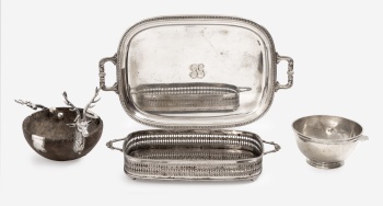 Lote compuesto por centro en madera y alpaca plateada representando ciervo, hojas y bellotas. Cuenco y 2 bandejas en alpaca y metal plateado con decoración vegetal, flores, etc. Estilo Luis XVI.