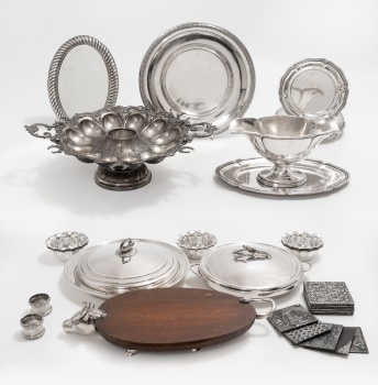Lote compuesto por 39 piezas en metal plateado, alpaca y estaño compuesto por: espejo de sobremesa, centro para huevos cocidos, bandejas, legumbreras, salsera, lavafrutas, bandeja de carne representando buey, servilleteros y posavasos.