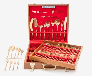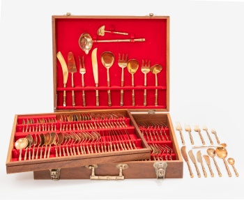 Cubertería tailandesa en bronce y níquel compuesta por 144 piezas: 24 tenedores de mesa, 24 cuchillos de mesa, 12 cucharas largas, 12 tenedores de postre, 12 tenedores postre largos, 12 cucharas de café, 12 cucharas de postre largas, 12 cuchillos postre, 12 cucharas de postre y 12 piezas de servir: cazo, cuchillo y tenedor de trinchar, cazo de salsa, pala de postre, etc. Thai Bronzewares Manufacturer CO. LTD. Bangkok, Thailandia. Estuche en madera.