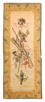 Tapiz pintado representando naturaleza muerta, caza y greca alrededor en tonos verdes y rosas. Estilo Luis XVI. Francia.
