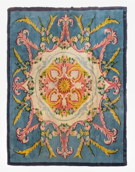 Alfombra de la Real Fábrica de Tapices de nudo español con medallón central representando sol con flores, hojas y rocallas en tonos azules, rosas, verdes y beige. Firmada R. F. T. Stuyck MD1843.