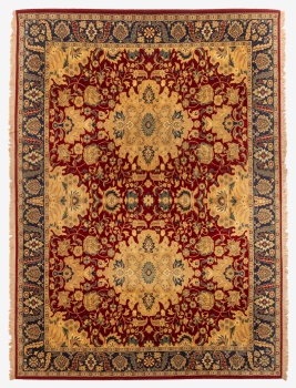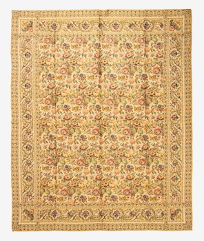 Alfombra de lana con decoración vegetal y flores en tonos beiges, azul, verde, rojo, etc.