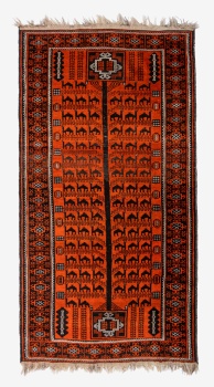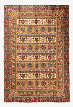 Alfombra de lana con decoración de animales, flores, hojas y greca alrededor en tonos granates, negros, verdes, naranjas y beiges.