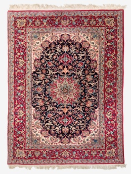 Alfombra de lana con decoración de medallón central, flores, hojas y greca alrededor en tonos granates, negros, azules, beige, etc. Isfahan. Irán.