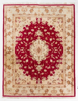 Alfombra de lana y seda con decoración vegetal, rosas, pájaros y greca alrededor en tonos rojos, beiges, verdes, negros, etc.