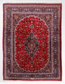 Alfombra de lana y seda con decoración de medallón central, vegetal y greca alrededor en tonos granates, verdes, azul y beige.