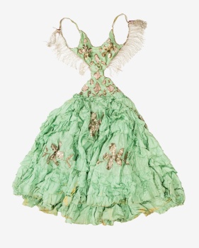 Vestido antiguo verde de volantes y bordados con lentejuelas plateadas representando flores y cascada de canutillos.