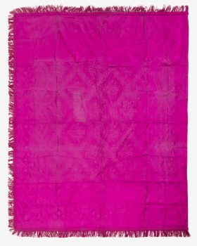 Colcha oriental en damasco morado con decoración de guirnaldas de flores.