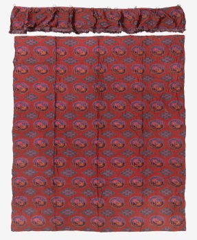 Cortina y bando oriental con decoración geométrica y vegetal, en tonos granates, verdes, azules, etc.