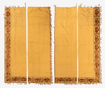 Conjunto de cortina dividida en 4 piezas en seda y terciopelo con decoración de flores en tonos oro viejo, verde, rosa, granate, etc.