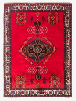 Alfombra de lana con decoración geométrica, medallón central, flores, hojas y orla alrededor en tonos rojos, verdes, azul y beiges.
