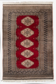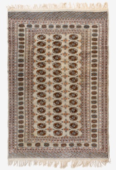 Alfombra de lana con decoración geométrica y greca alrededor en tonos rosa y beiges. Pakistán.