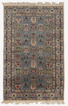 Alfombra de lana y seda con decoración vegetal y greca alrededor en tonos azules y beiges. Persa.
