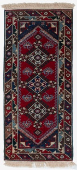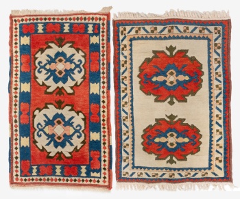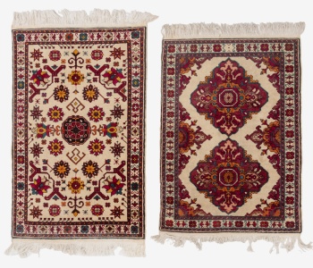 Lote compuesto por 2 alfombras de lana con decoración geométrica y flores en tonos granates, azules, beiges, etc, Rusia.