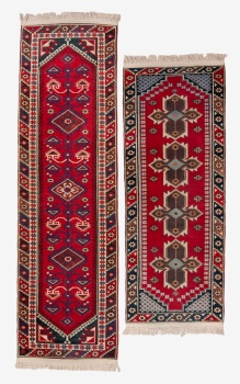 Lote compuesto por 2 tiras de pasillo en lana con decoración geométrica y flores en tonos granates, rojos, azules, verdes, beiges, etc.