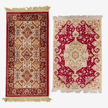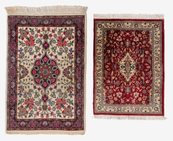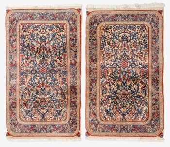 Lote compuesto por 2 alfombras de lana con decoración de flores, hojas y greca alrededor. Biotar. Irán.