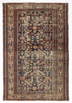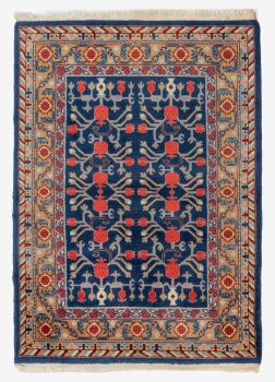 Alfombra de lana con decoración vegetal y geométrica en tonos azules, ocres, calderas y marrones.