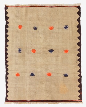 Kilim con decoración geométrica en tonos beige, marrón, azul y naranja.