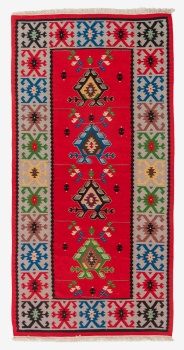 Kilim con decoración geométrica y greca alrededor en tonos rojos, verdes, azules, negro, beige, etc.