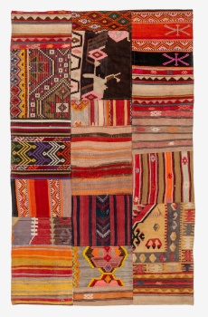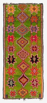 Kilim con decoración geométrica en tonos verdes, rojos, granates, beiges, rosas, amarillos, etc.