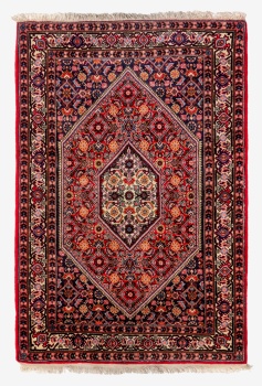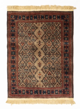 Alfombra de lana con decoración geométrica y flores en tonos granates, beiges, azules, etc. Irán.