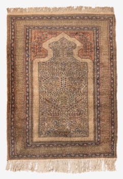 Alfombra de lana y seda con decoración de medallón central, flores, hojas y greca alrededor en tonos verdes, calderas y beiges.