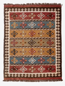 Alfombra kilim con decoración geométrica en tonos marrones, azules, granates y mostaza.
