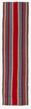 Kilim con decoración de rayas en tono beige, rojo y azul.