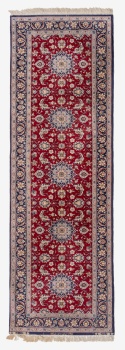 Tira de pasillo con decoración de flores, hojas y rocallas en tonos azules, granates y beiges. Firmada. Isfahan. Irán.