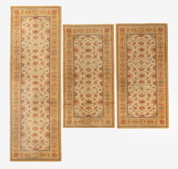 Conjunto de 3 alfombras de lana con decoración vegetal, flores y greca alrededor en tonos beiges, verdes, rojos, azules, etc.