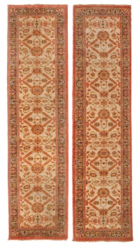 Pareja de tiras de pasillo con decoración vegetal, flores y greca alrededor en tonos salmón , teja, beige, marrón, azul, etc.