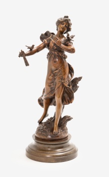 (XIX - XX) "Dama con pájaros" Firmado: L. F. Moreau Bronce patinado 44 x 18 x 16,5 cm.