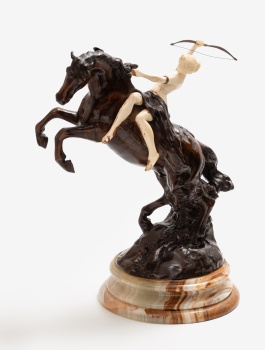 (C. 1900) "Diana cazadora a caballo" Firmado: Camels Bronce patinado / Base de ónice 50 x 28 x 38 cm.