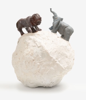 (S. XX) "Elefante y león sobre la tierra." Escayola / Papel pintado 48 x 37 x 40 cm.