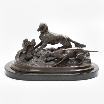 (S. XX) "Perros a la caza del pato" Metal patinado / Base en mármol 24 x 45 x 24 cm. (Siguiendo modelo de P. J. Mene)