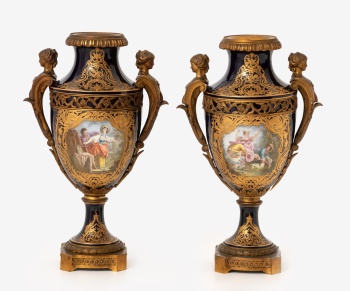 Pareja de jarrones en porcelana azul cobalto con medallones centrales representando escena galante en el jardín, jóvenes jugando a la gallinita ciega y paisajes con río, dorados en relieve alrededor con decoración de guirnaldas de flores, rocallas y hojas. Remates y base en bronce dorado con decoración de flores, hojas y rocallas. Asas en bronce dorado representando bustos de damas y hojas. Estilo Luis XVI. Época Napoleón III. Francia. Manufactura Sevres.