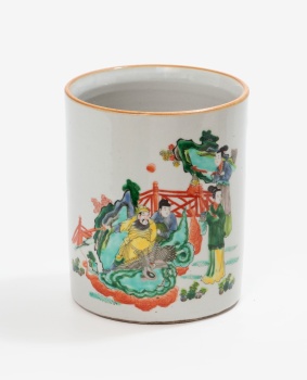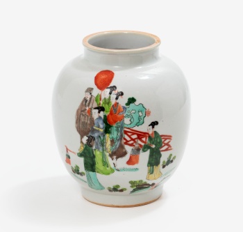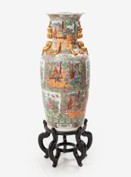 Jarrón oriental en porcelana policromada y dorada en relieve con decoración de diferentes escenas cotidianas con emperadores, geishas, guerreros, flores alrededor, mariposas, hojas, etc., asas representando furias y lagartijas alrededor. Peana en madera.