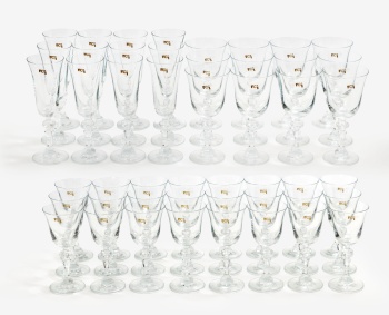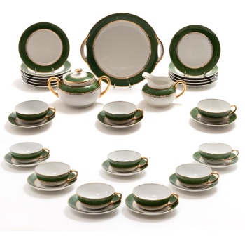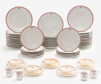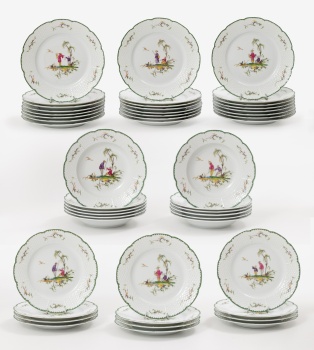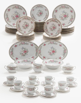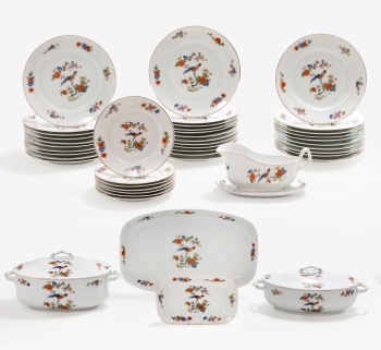 Vajilla en porcelana policromada y dorada con decoración de flores y cestas, compuesta por 47 piezas: 22 platos llanos, 10 platos hondos, 10 platos de postre, sopera, salsera, almendrero, fuente oval pequeña y frutero. Sello en la base. Manufactura Bohemia. Checoslovaquia