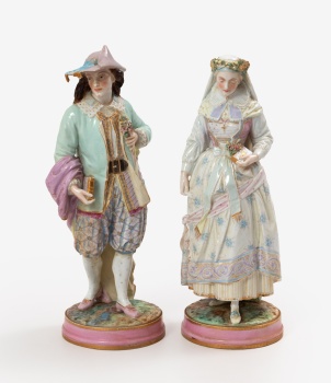 Pareja de figuras en porcelana policromada representando Caballero y Doncella vestida al estilo renacentista. Manufactura Vion & Baury