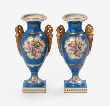 Pareja de jarrones en porcelana policromada y dorada con medallones centrales con decoración de flores, hojas, rocallas y asas representando esfinges. Estilo Imperio. Manufactura Limoges.